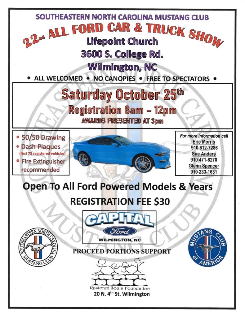 SENC Mustang Club “All Ford” Show – Sat. 25th, 8-3pm, Lifepoint Church, 3600 S. College Rd., Wilmington