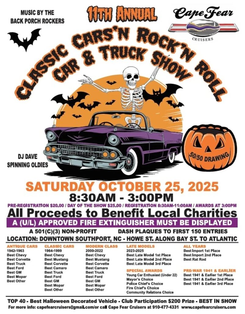 Classic Cars’n Rock’n & Roll Car Show – Sat. 25th, 8-3pm, Downtown Southport
